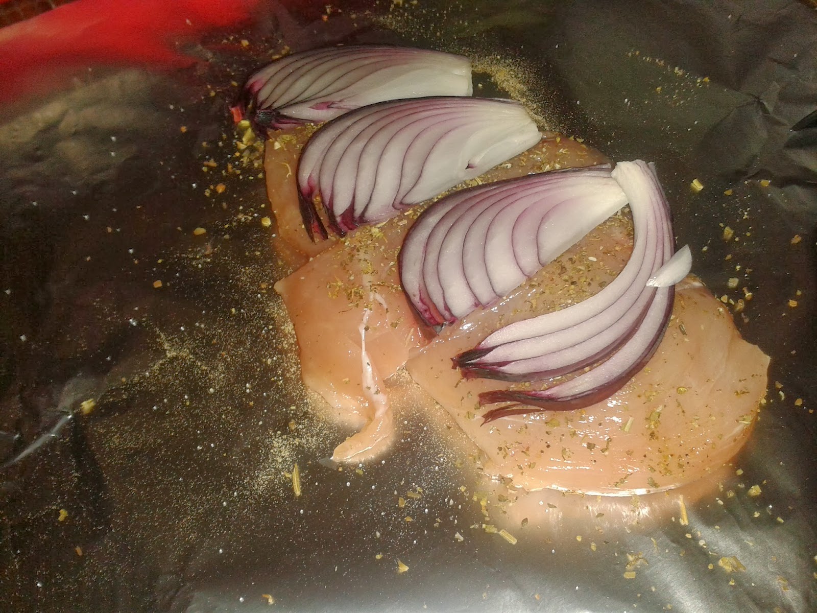 Cebulę kroimy w pół plastry, układamy na każdym kawałku kurczaka.